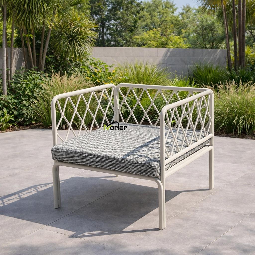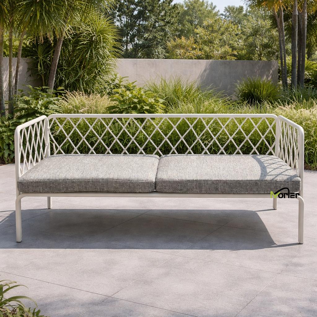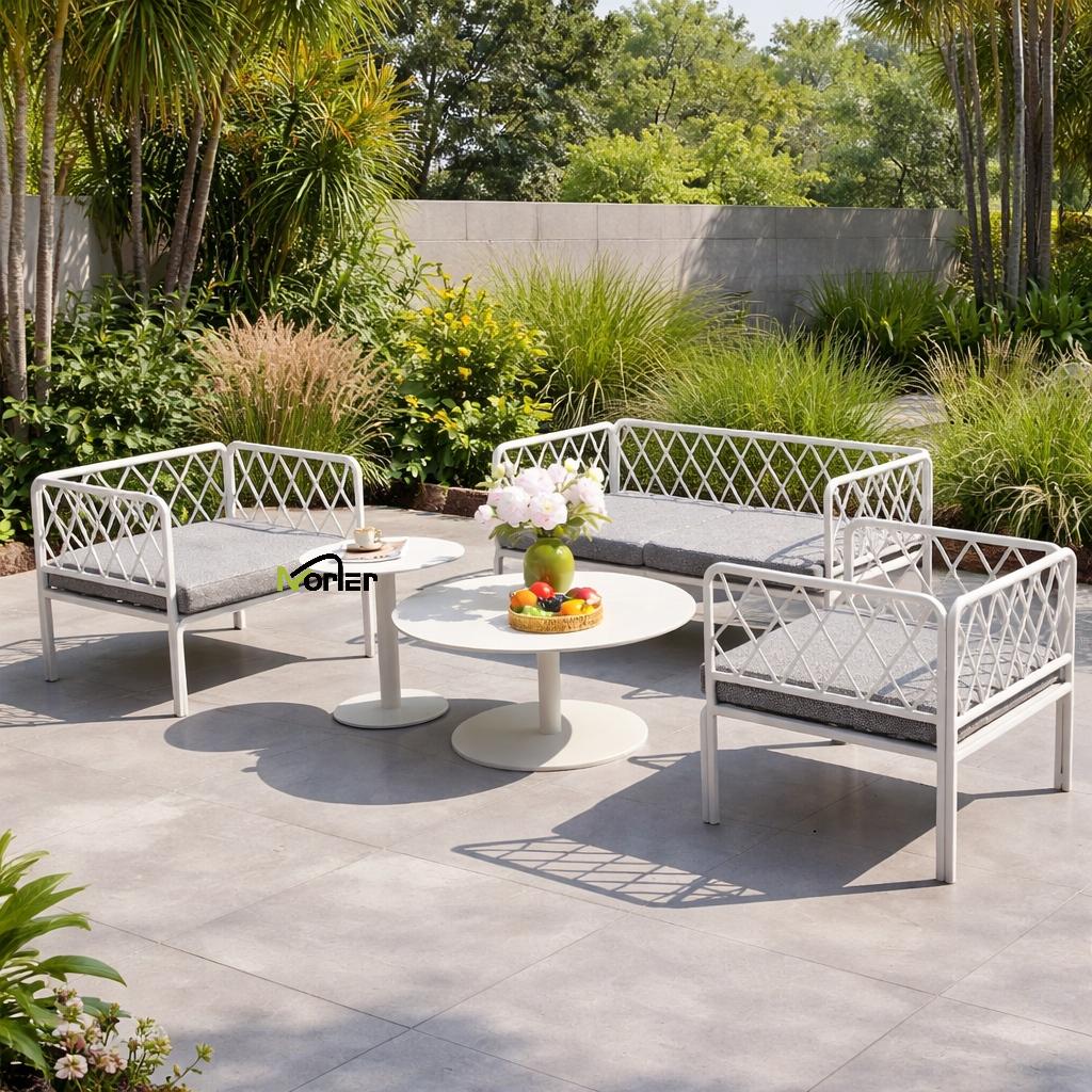 Cet ensemble de canapés d'extérieur moderne présente un design épuré et minimaliste avec une structure en métal géométrique magnifiquement conçue. La structure en treillis ouvert crée une apparence légère et élégante tout en conservant un support structurel solide.